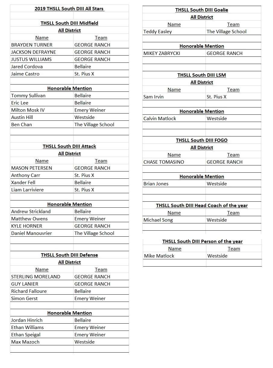 The Texas Lacrosse Officials Association officials voted to award its annual “Sam Chambers Award for Sportsmanship and Coaching Excellence” to both Mike Donnelly (Episcopal) and Nick Ignatiev (Bellaire). As in 2019, the award is being conferred upon two winners since the support for both coaches was very strong. The decision to declare two winners of award was the preferred outcome, as was done in 2019. The testimonials in favor of each coach were just awesome to hear. Both coaches have been magnificent supporters of lacrosse in Houston, and both coaches are terrific role models for good sportsmanship. Tim Bohdan , TXLOA President |