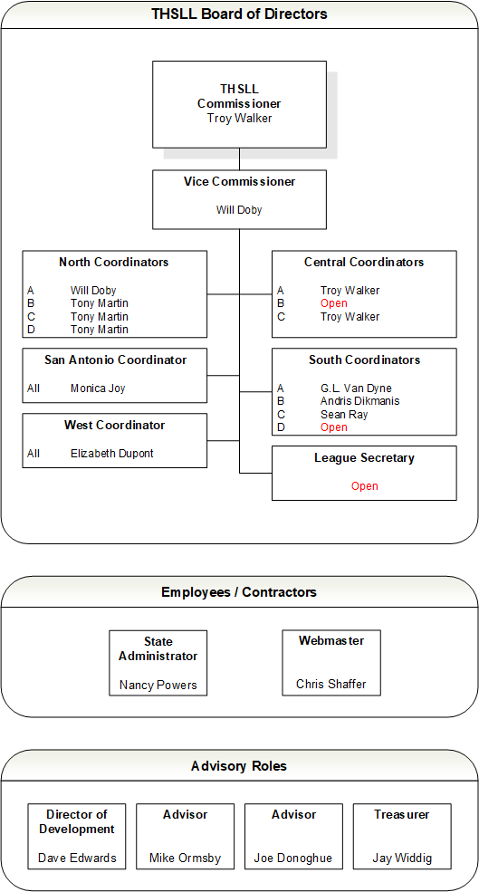 The State Administrator position is accountable to the THSLL board, reporting to the THSLL Commissioner. The State Administrator communicates with the Member programs and District Coordinators facilitating the administrative duties for the THSLL.